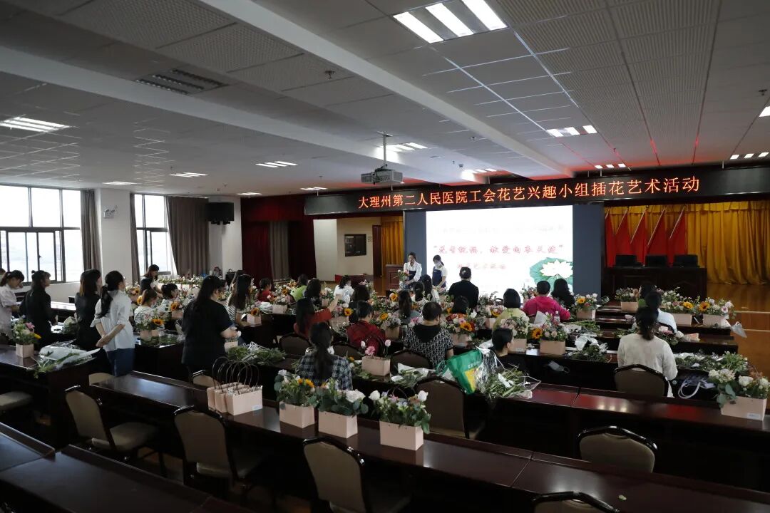 为了提升职工的综合素质技能,审美情趣和人文情怀,提高生活质量,增加凝聚力,在一年一度的国际护士节将来临之际,大理州第二人民医院工会茶艺花艺兴趣小组于2022年5月11日晚上组织开展了以“花香祝福,献爱白衣天使”为主题的插花艺术活动,有44位职工参加了本次活动,同时借此次活动向大理州第二人民医院所有护理人员提前送上节日的祝福。