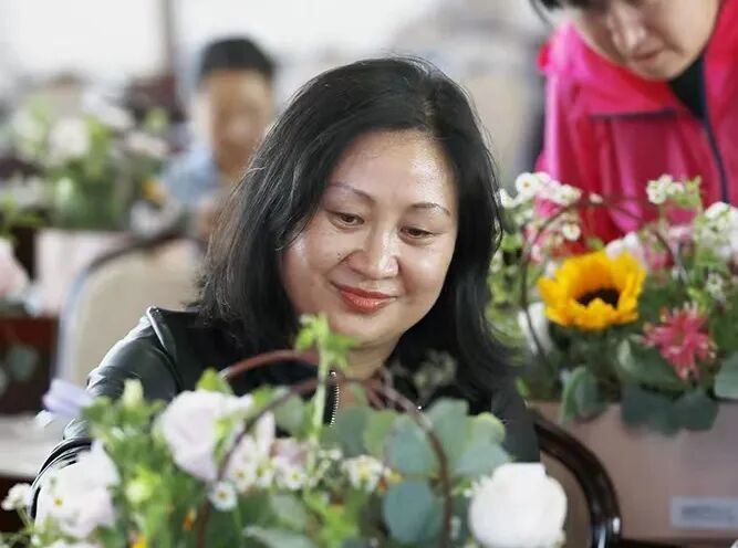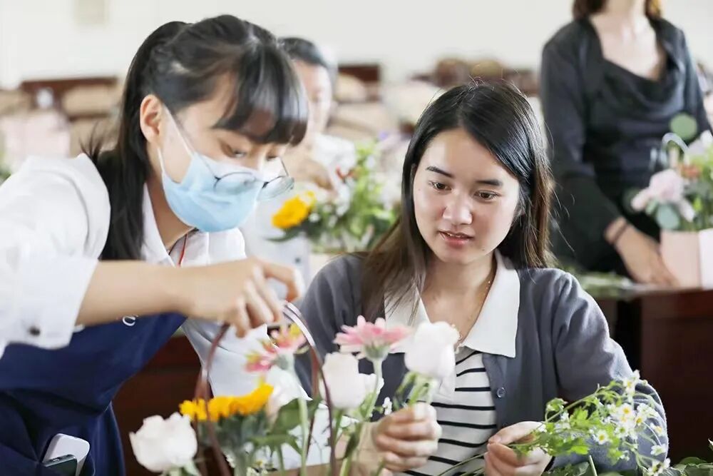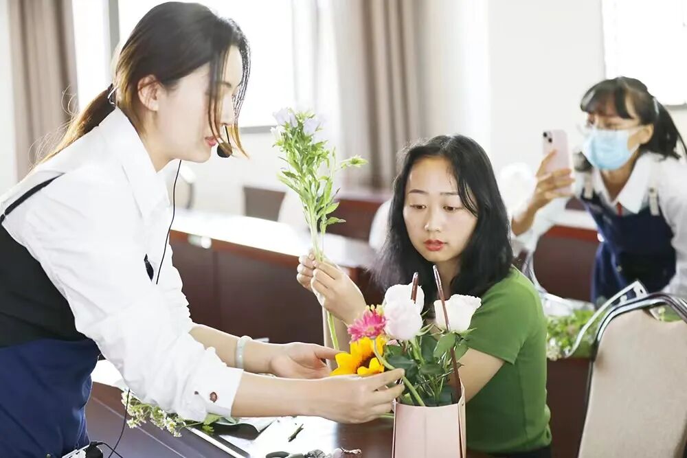 活动中,花艺老师为每位学员准备了花篮、花材及花艺工具,在舒缓美妙的轻音乐中专业的花艺老师通过花色品种、色彩搭配等基本理论教导大家插花技术。