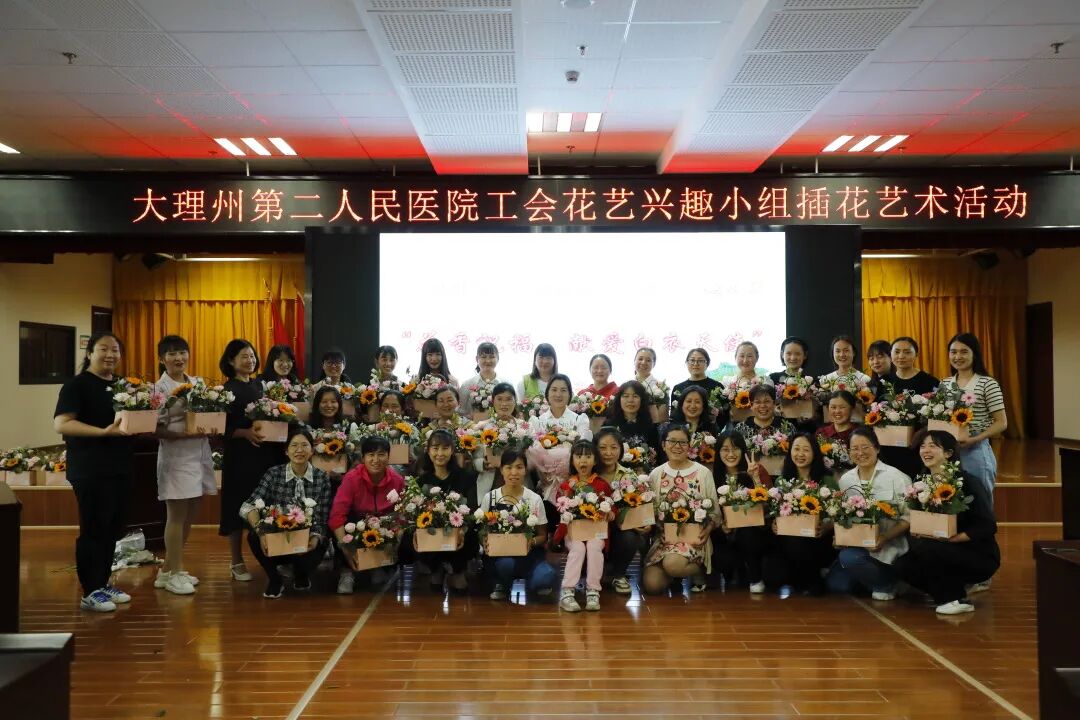 最后,大家捧着自己的插花作品合唱大理州第二人民医院院歌《为你守护》,插花活动在优美的歌声及大家开心的笑容中结束。